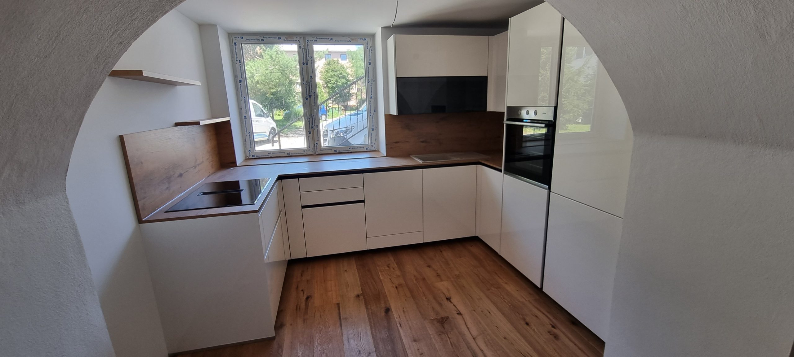 Naš najbolj priljubljen model kuhinje Silbermond je tokrat svoj dom dobil v Dramljah. Pri družini, ki si je močno želela, da bi njihova kuhinja bila zaprta do stropa, imela eleganten videz in bi nudila veliko prostora za shranjevanje. Odločili so se za model Silbermond v belem sijaju, z dekorjem lesa Asteiche, steklenimi vitrinami in črnimi okrasnimi paneli na steni.