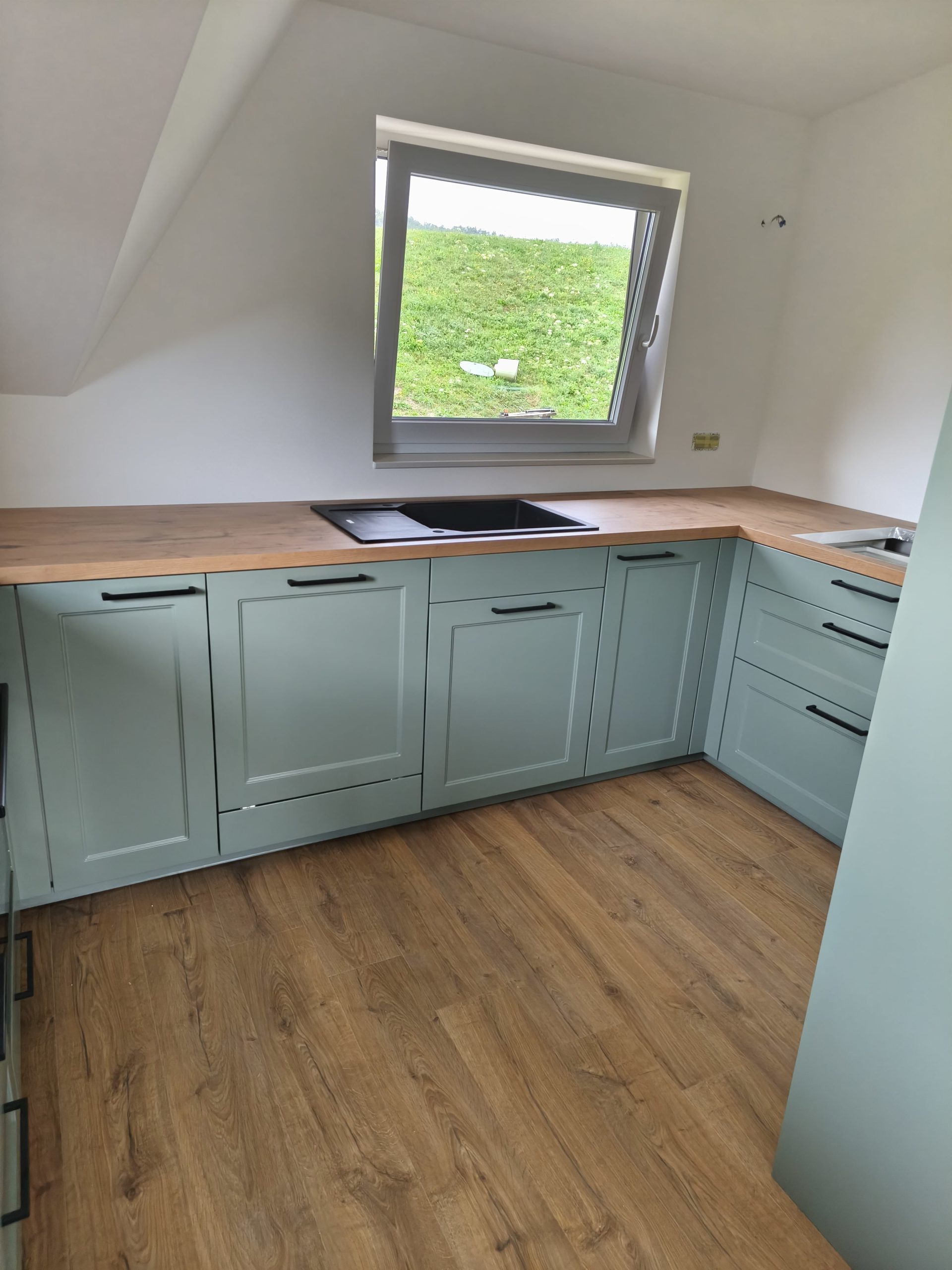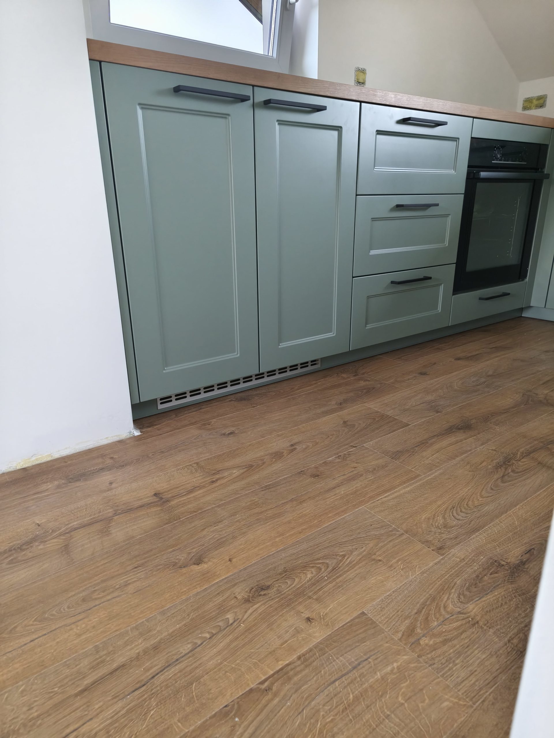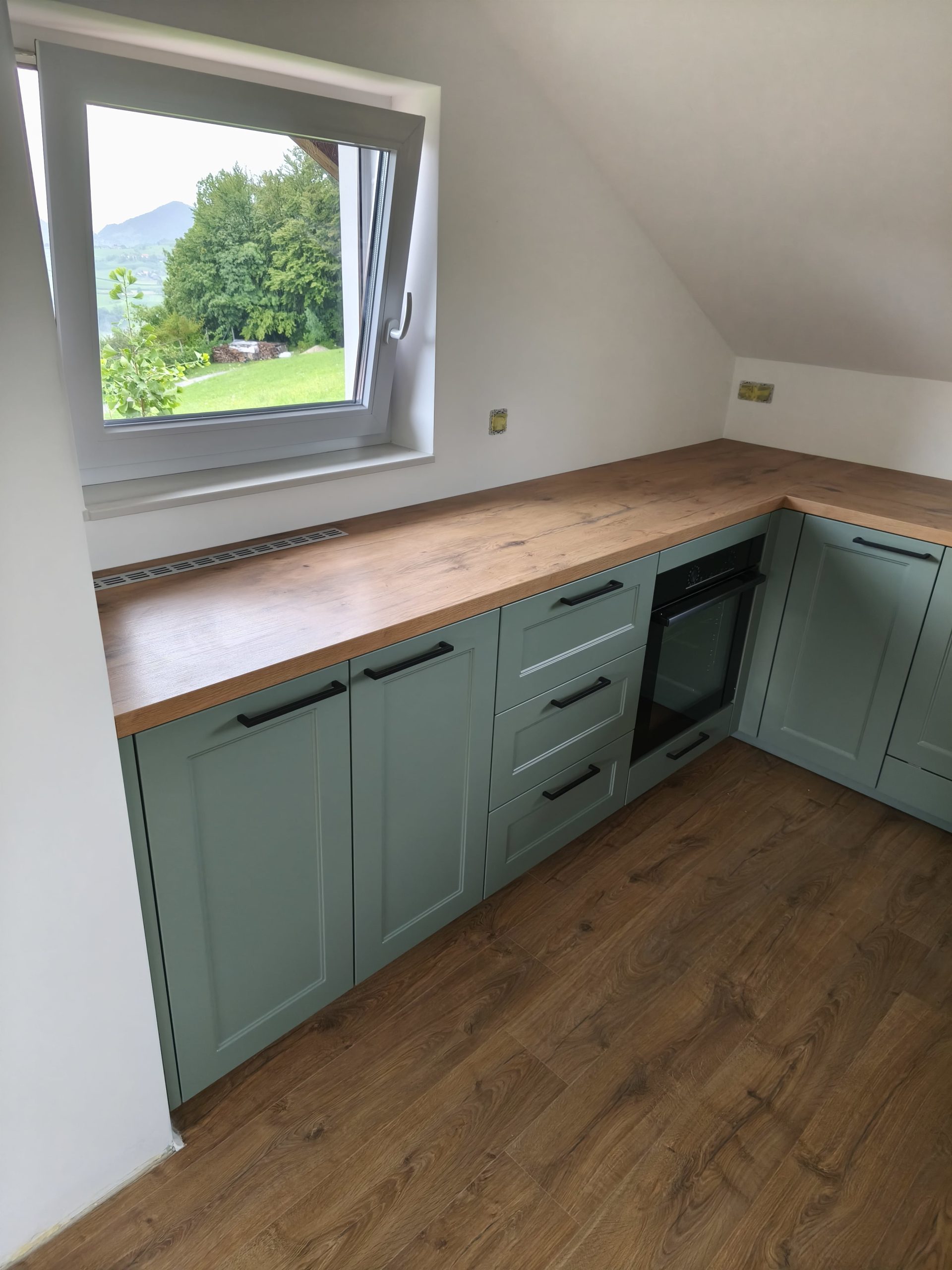 Izbran model se ponaša s frontami v odtenku Fjord Grün, ki navdušuje z umirjenim in brezčasnim videzom. Lesni dekor Burguesa pa v prostor doda toplino in naravno teksturo. Celoten videz kuhinje smo elegantno popestrili in zaokrožili z ročaji v črni barvi.