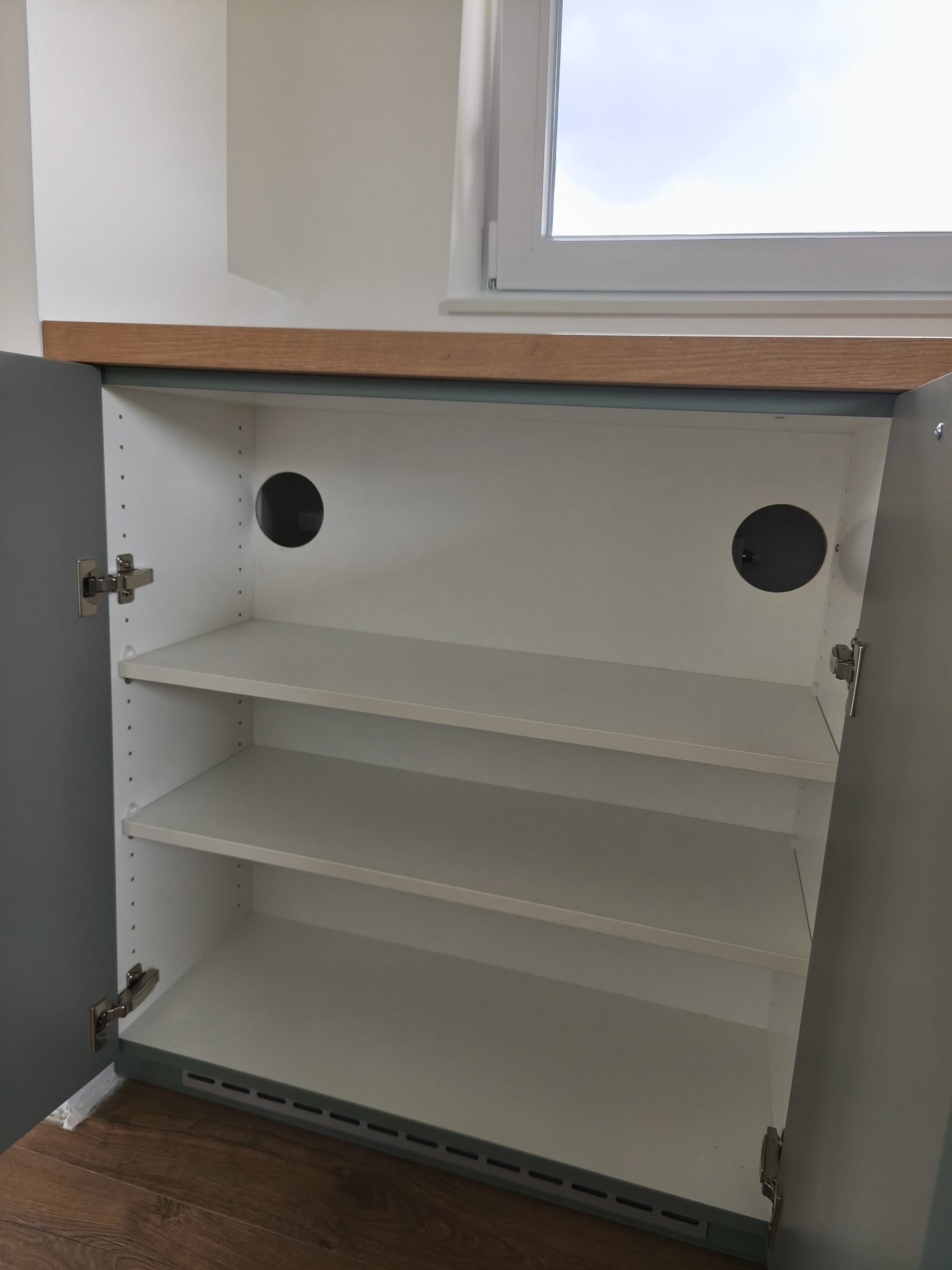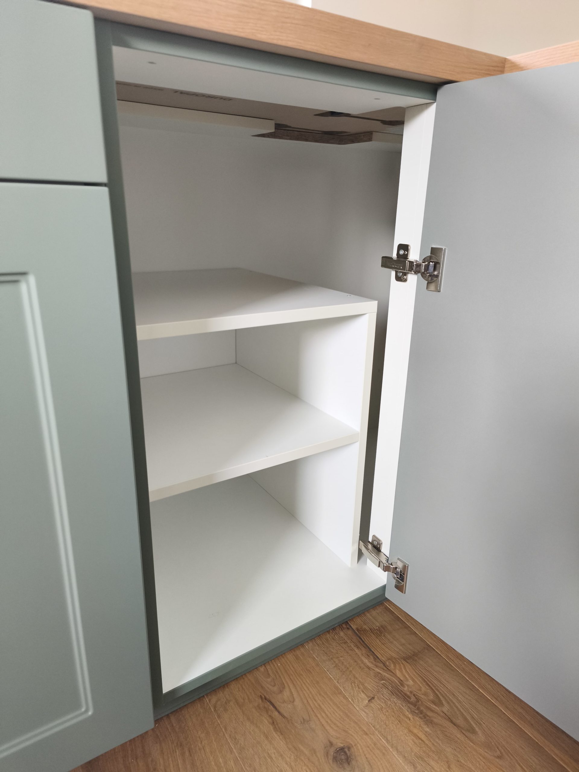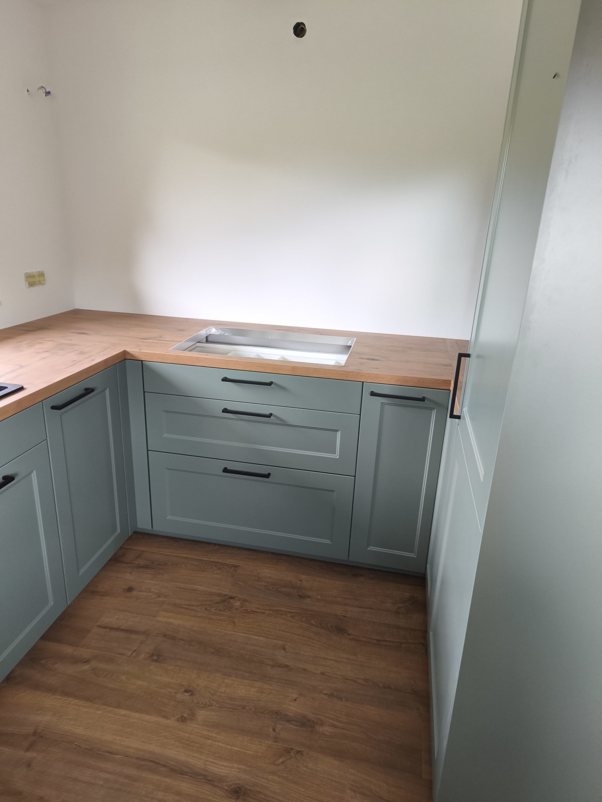 Izbran model se ponaša s frontami v odtenku Fjord Grün, ki navdušuje z umirjenim in brezčasnim videzom. Lesni dekor Burguesa pa v prostor doda toplino in naravno teksturo. Celoten videz kuhinje smo elegantno popestrili in zaokrožili z ročaji v črni barvi.