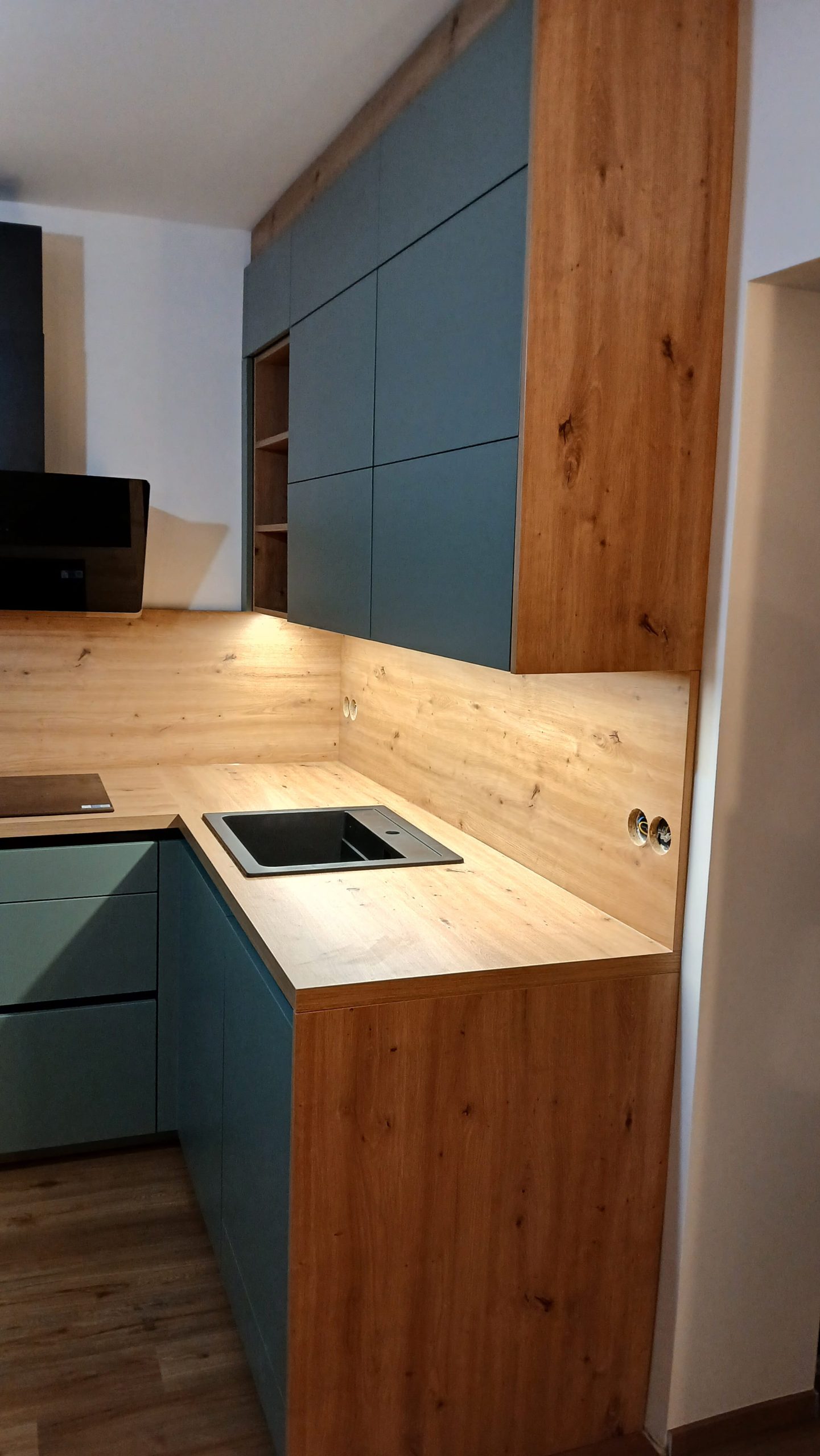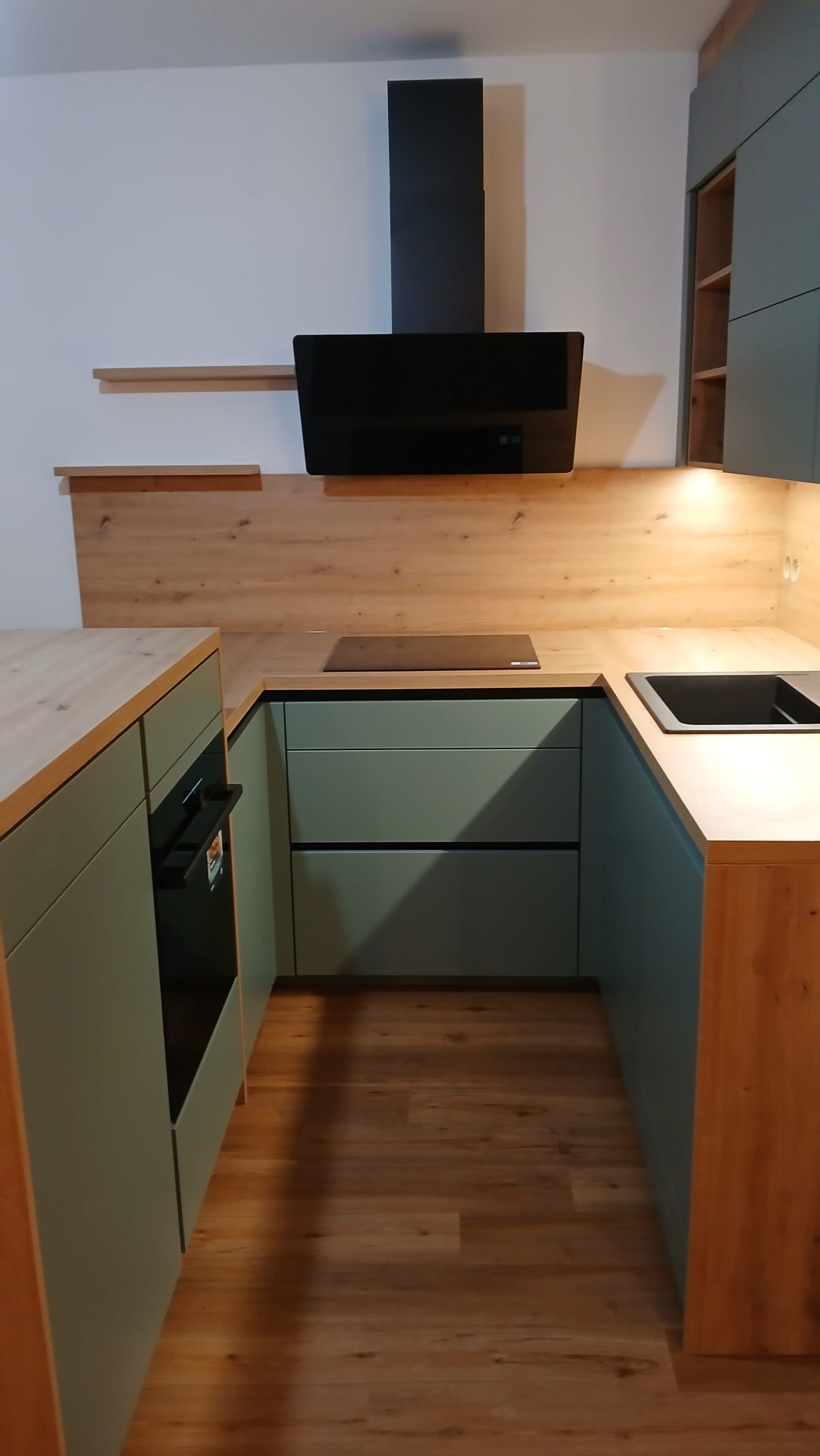Odtenek Fjordgrün mat prinaša mir, ravnovesje in občutek povezanosti z naravo. V kombinaciji z dekorjem Asteiche mat kuhinja pridobi globino in značaj, ne da bi bila vizualno naporna.