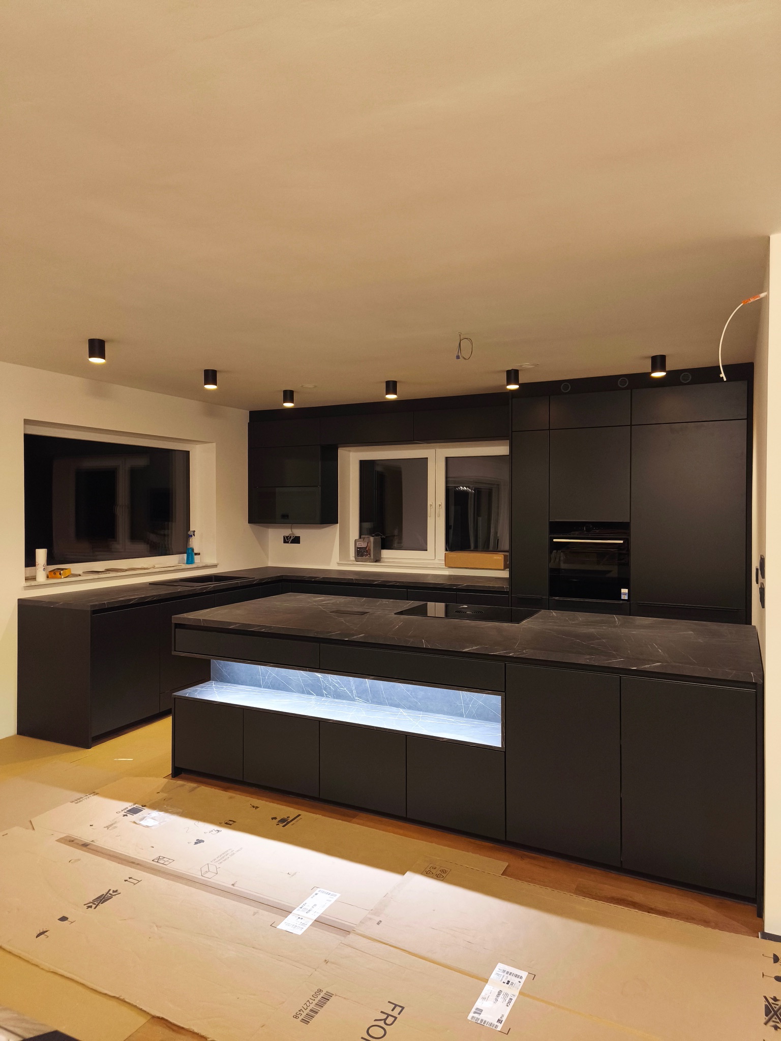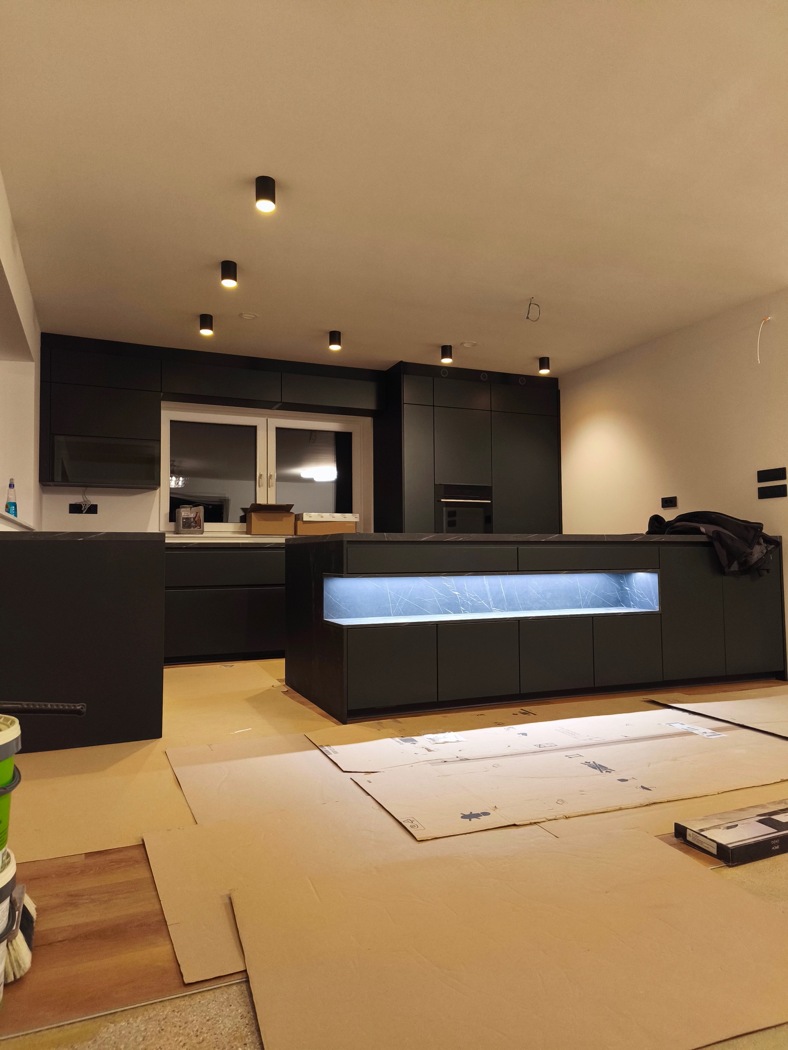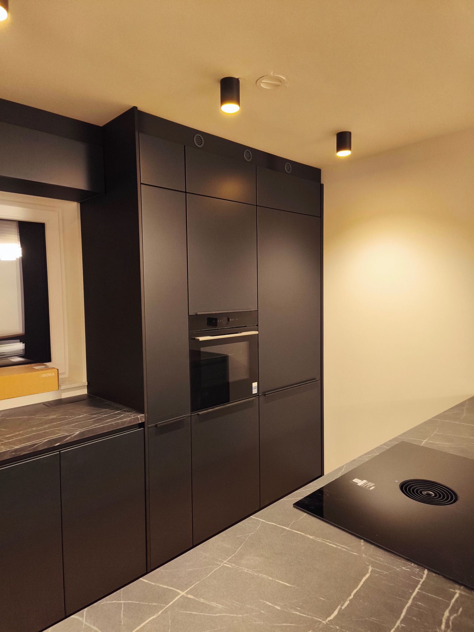 Kuhinjo smo zaprli do stropa ter s tem popolno izkoristili razpoložljiv prostor. Tako smo stranki zagotovili dodaten prostor za shranjevanje.