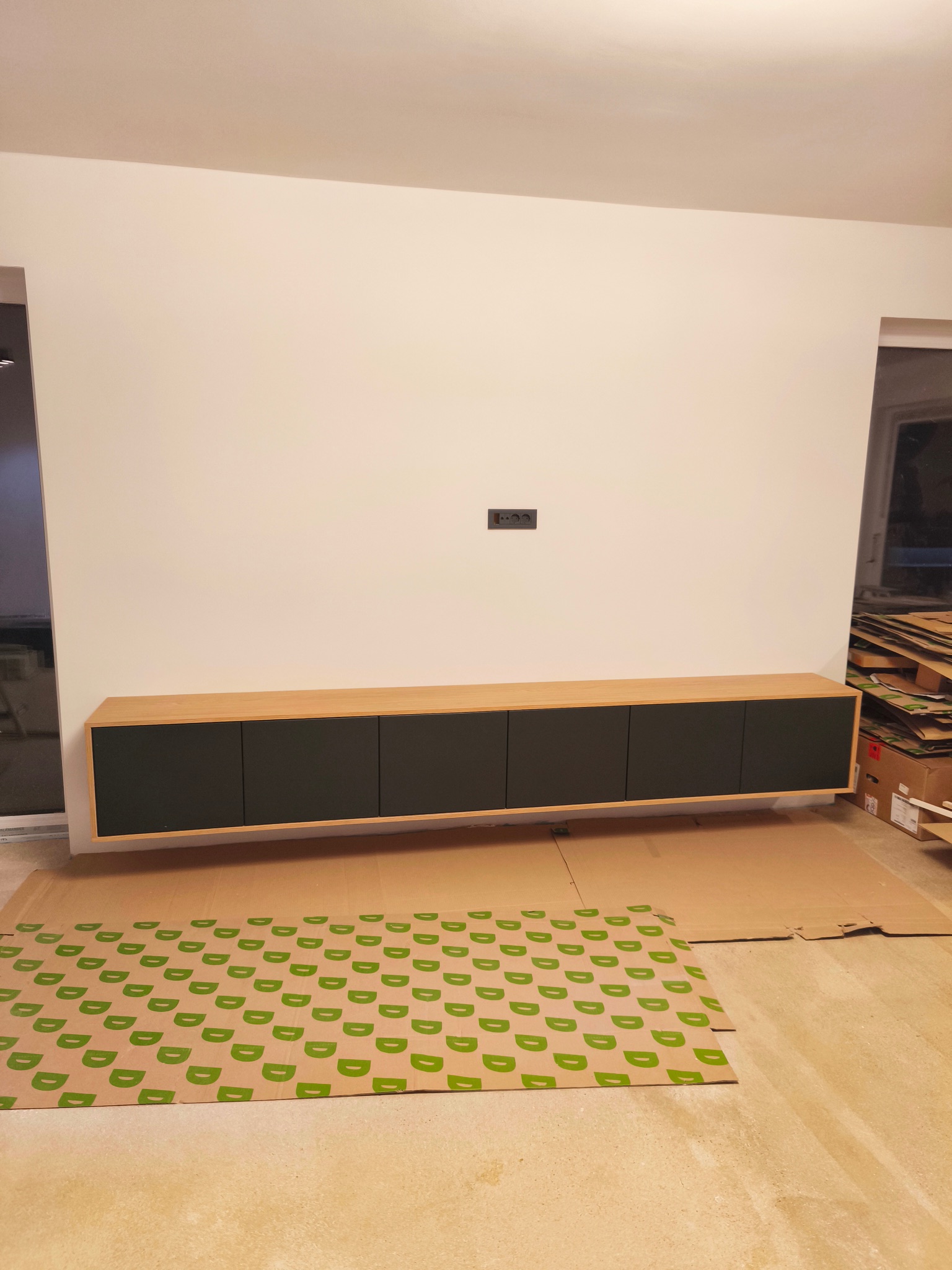 Poleg kuhinje smo za stranko uredili tudi dnevni regal, ki odlično poveže bivalni prostor v celoto.