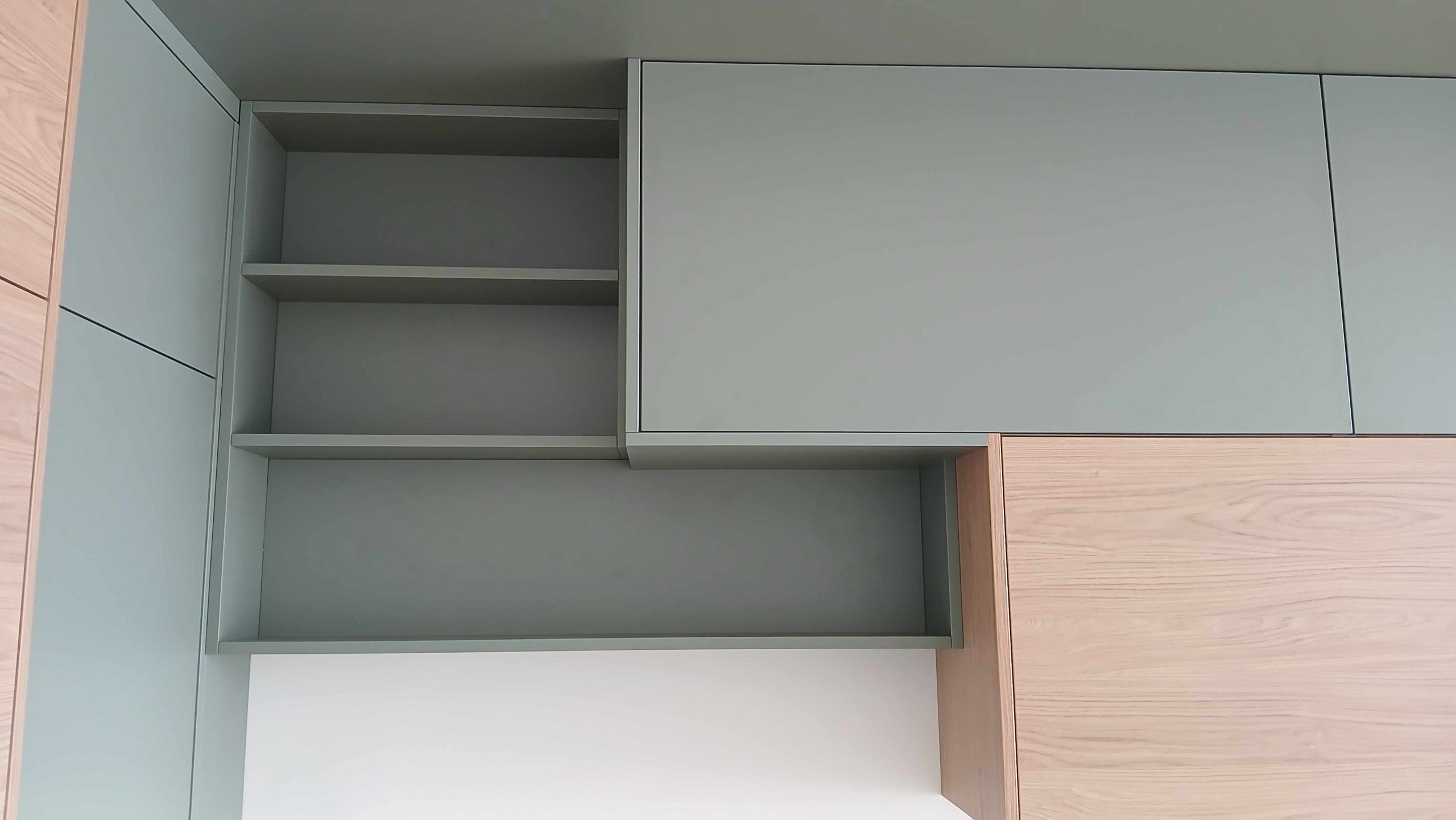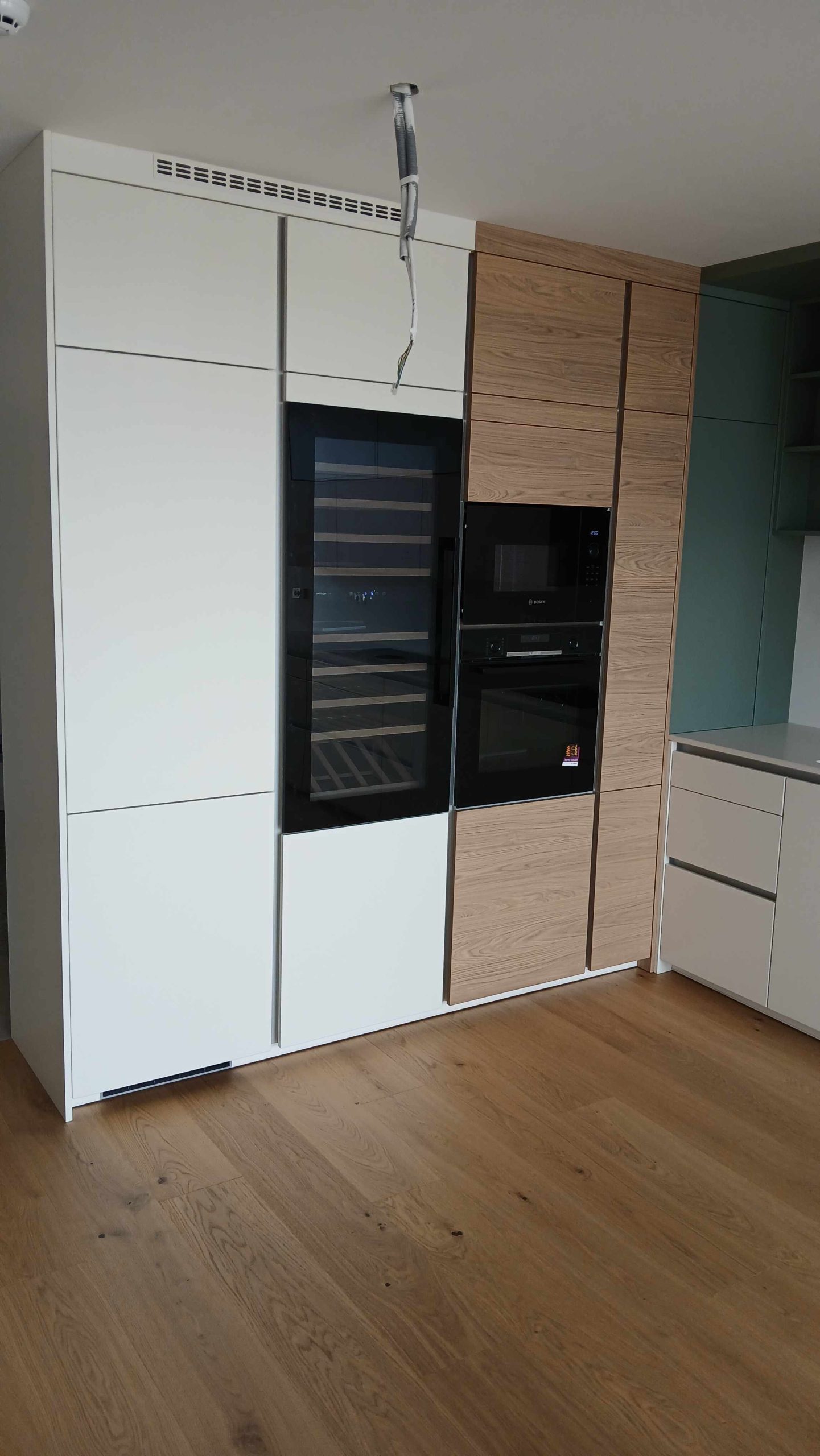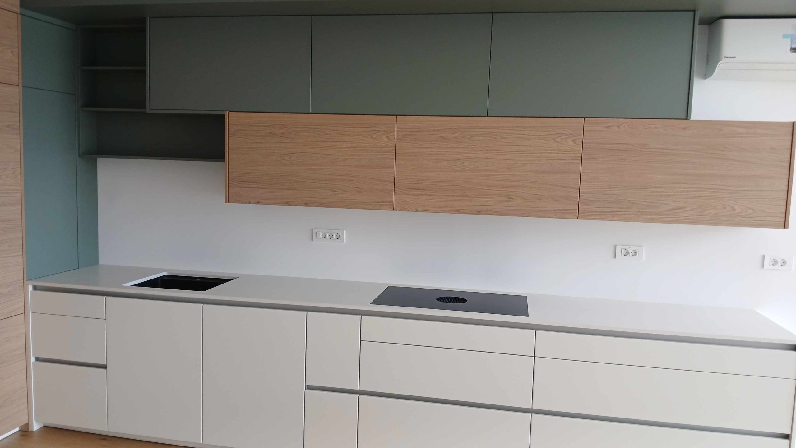 Montirali smo kuhinjo Silbermond, ki s kombinacijo front v beli mat barvi ter visečimi omarami v odtenku Fjord Grün očara vsakogar. V prostor pa takšna kombinacija vnaša občutek svežine.