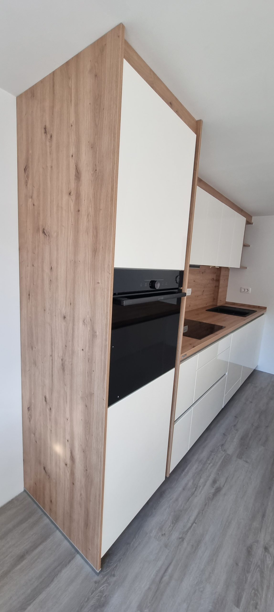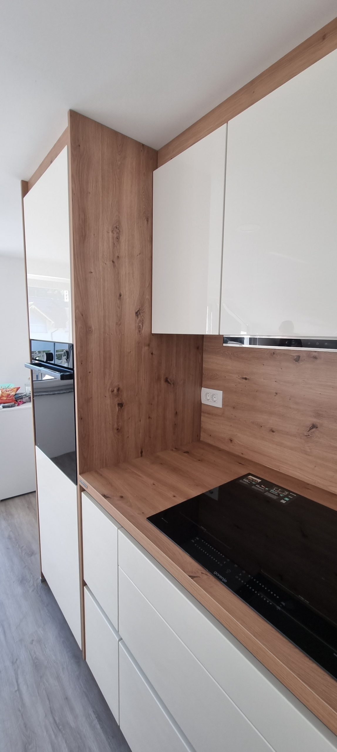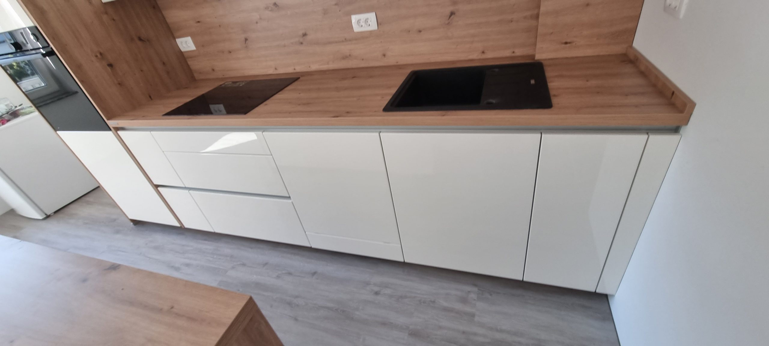 Montirali smo model Silbermond v kombinaciji belih sijaj front in lesnega dekorja Asteiche. Svetle fronte optično povečajo prostor, leseni dodatki pa prinašajo občutek domačnosti in naravnega ravnovesja.