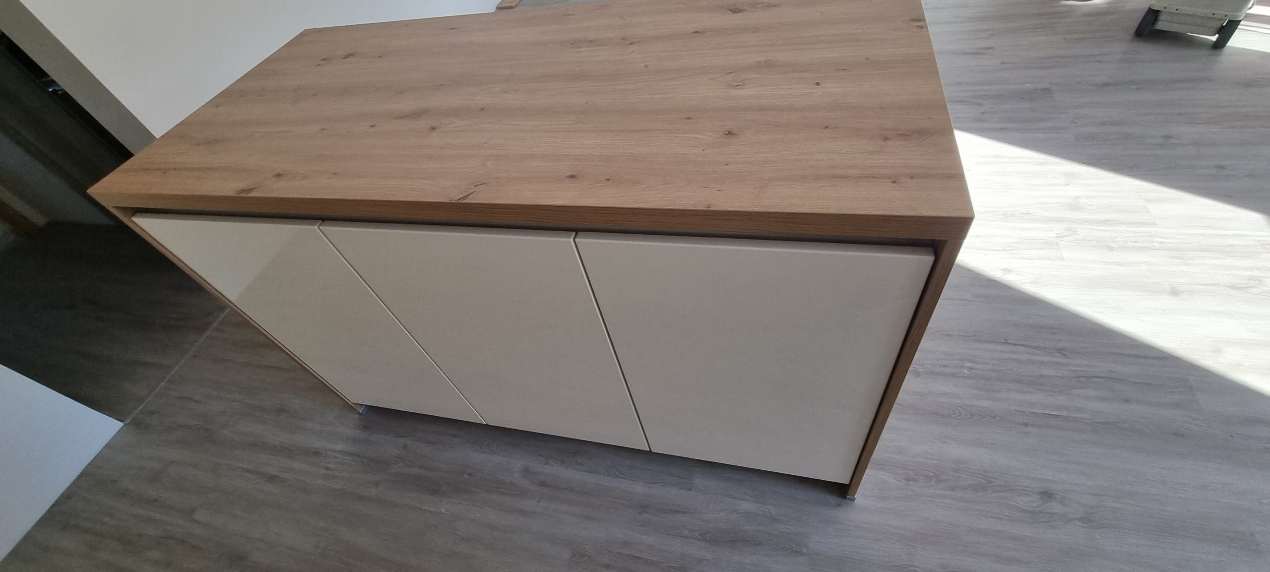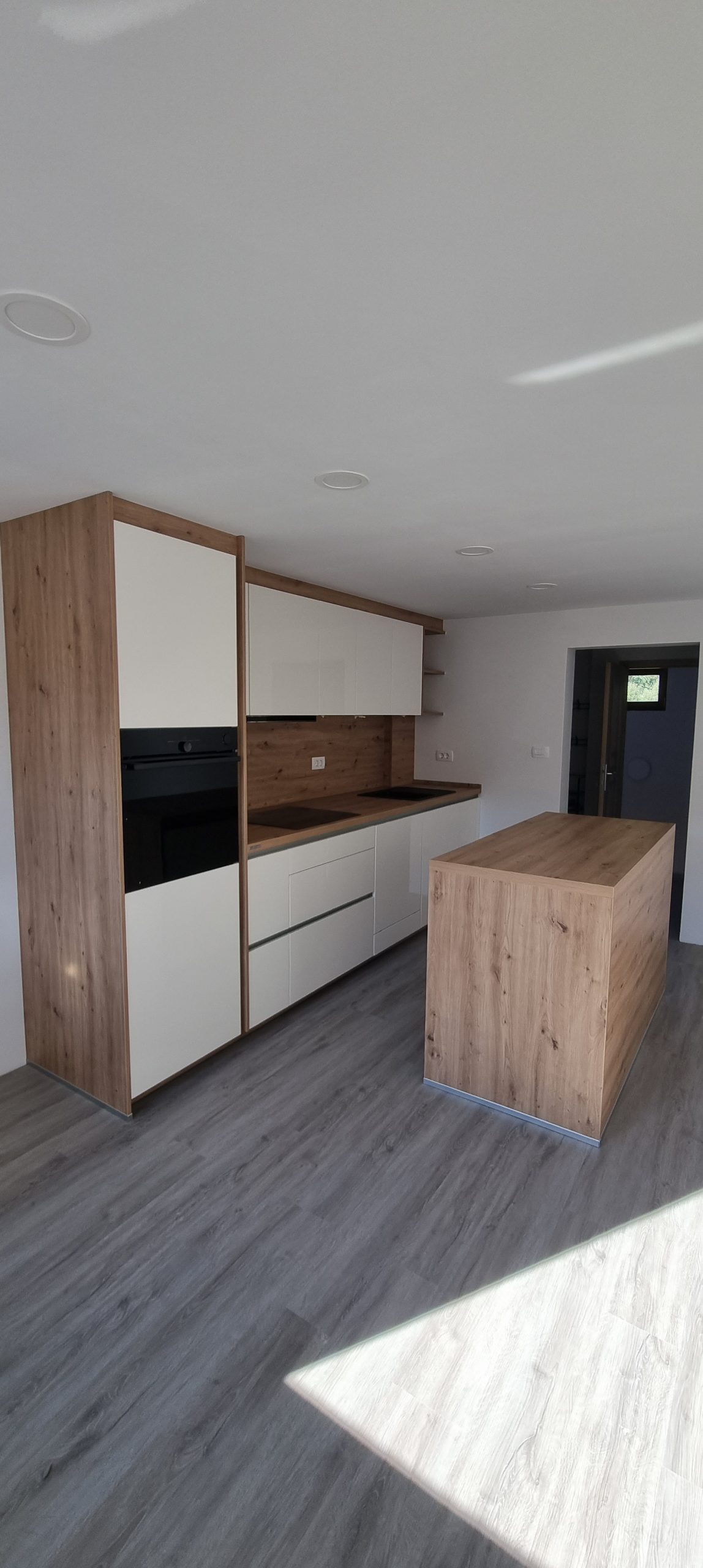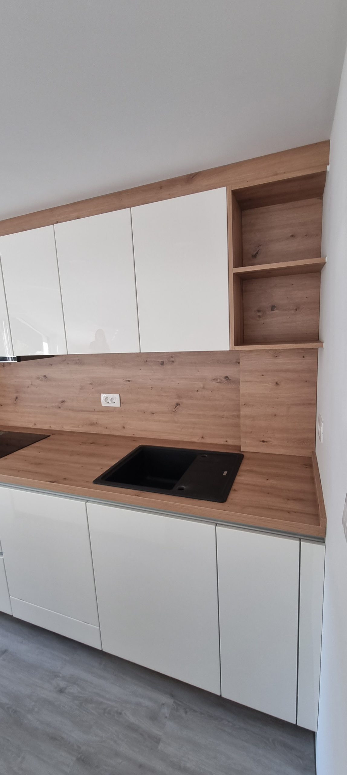 Montirali smo model Silbermond v kombinaciji belih sijaj front in lesnega dekorja Asteiche. Svetle fronte optično povečajo prostor, leseni dodatki pa prinašajo občutek domačnosti in naravnega ravnovesja.