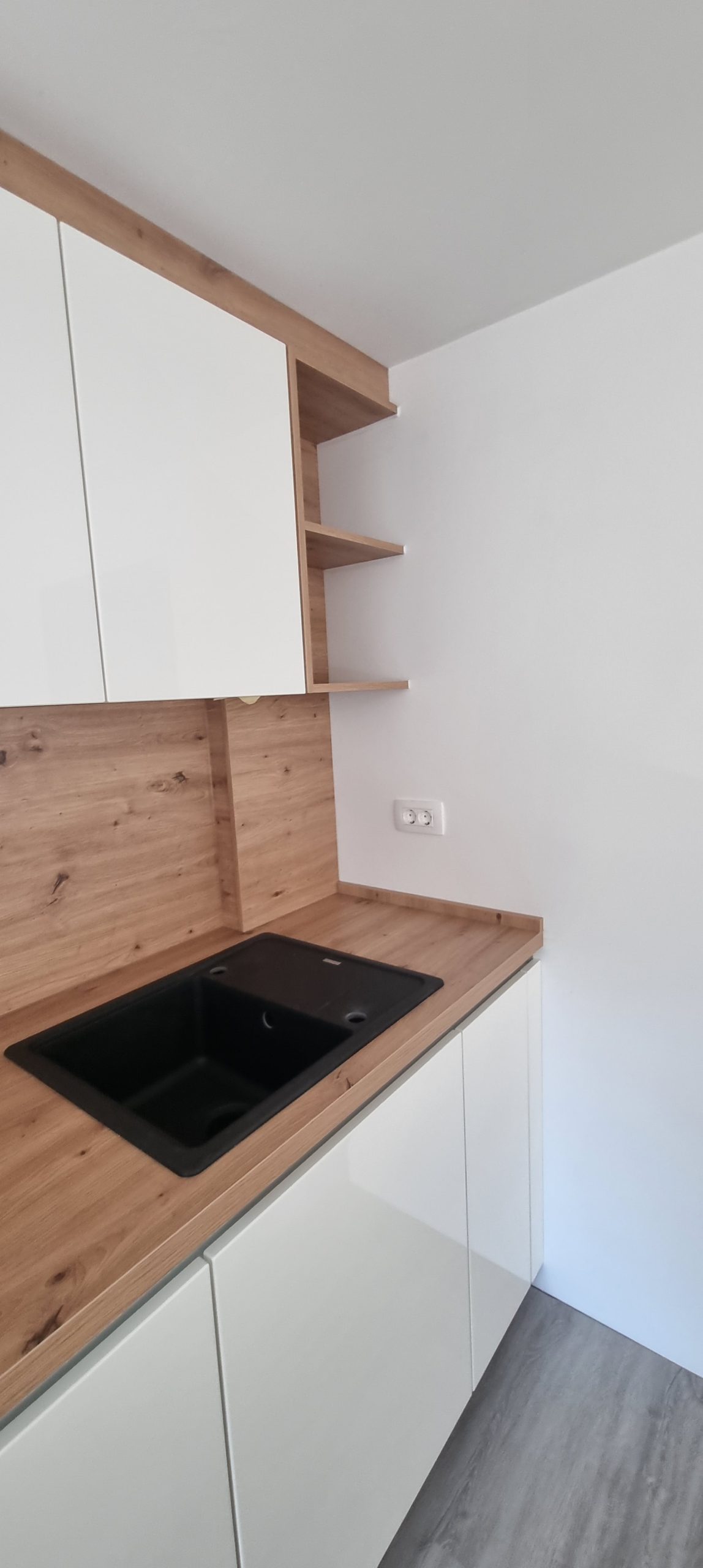 Prav tako smo stranki izpolnili željo po funkcionalnih gospodinjskih aparatih – to smo uspeli z aparati znamke Gorenje, napo Siccabo in koritom znamke Franke.