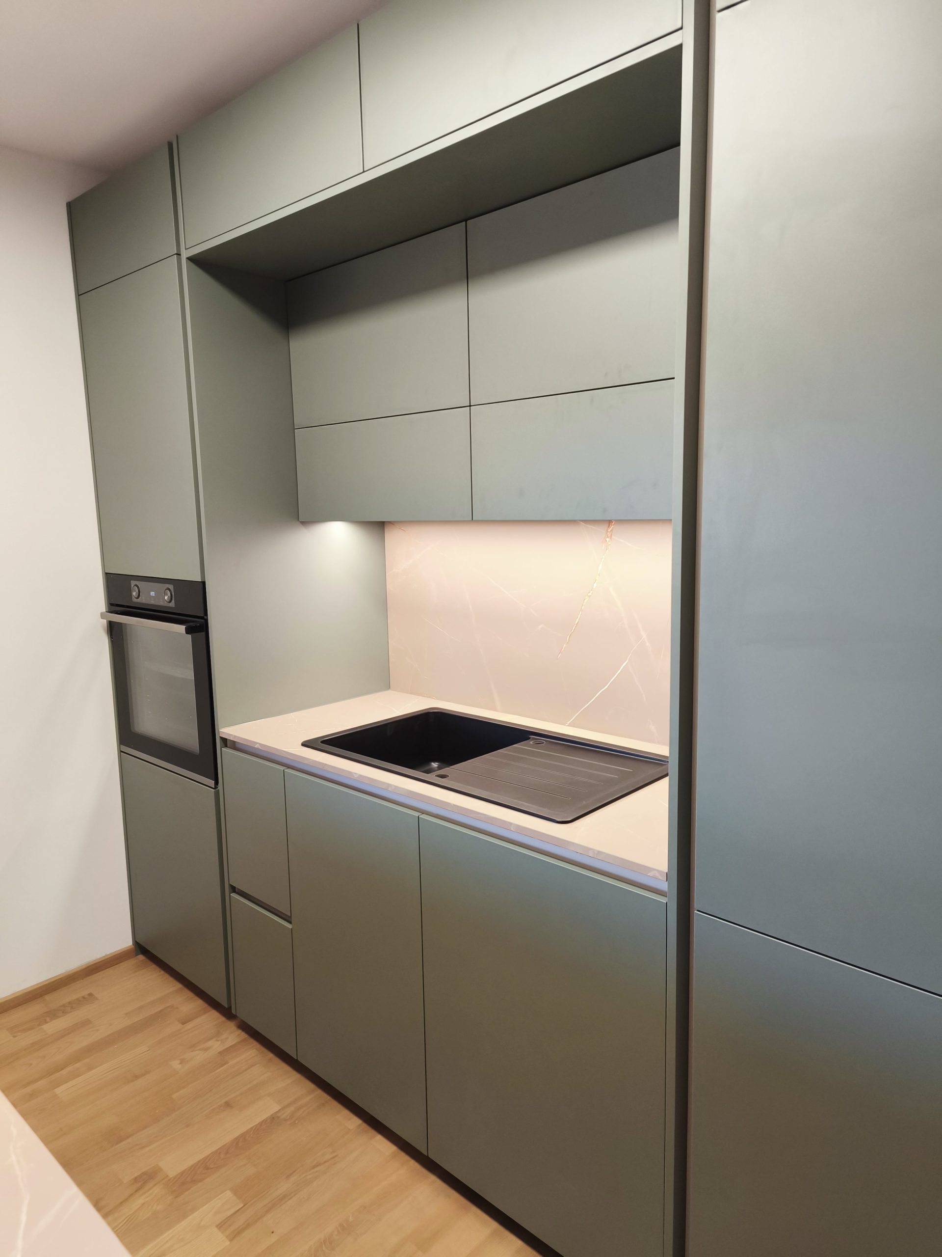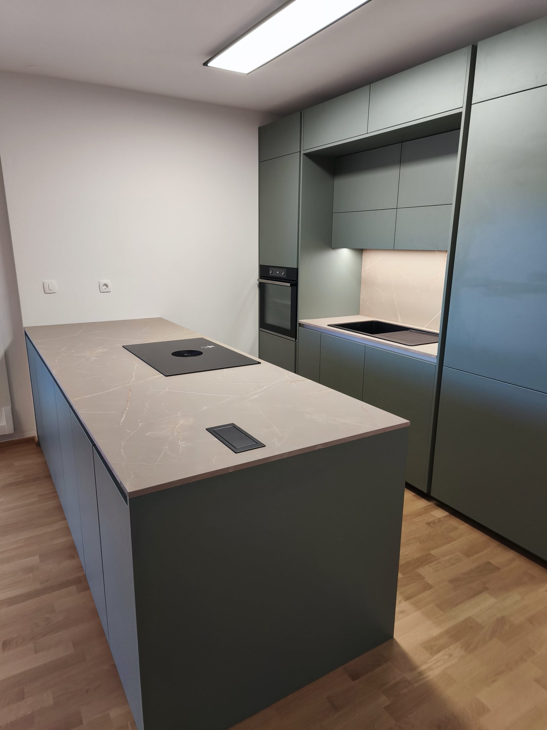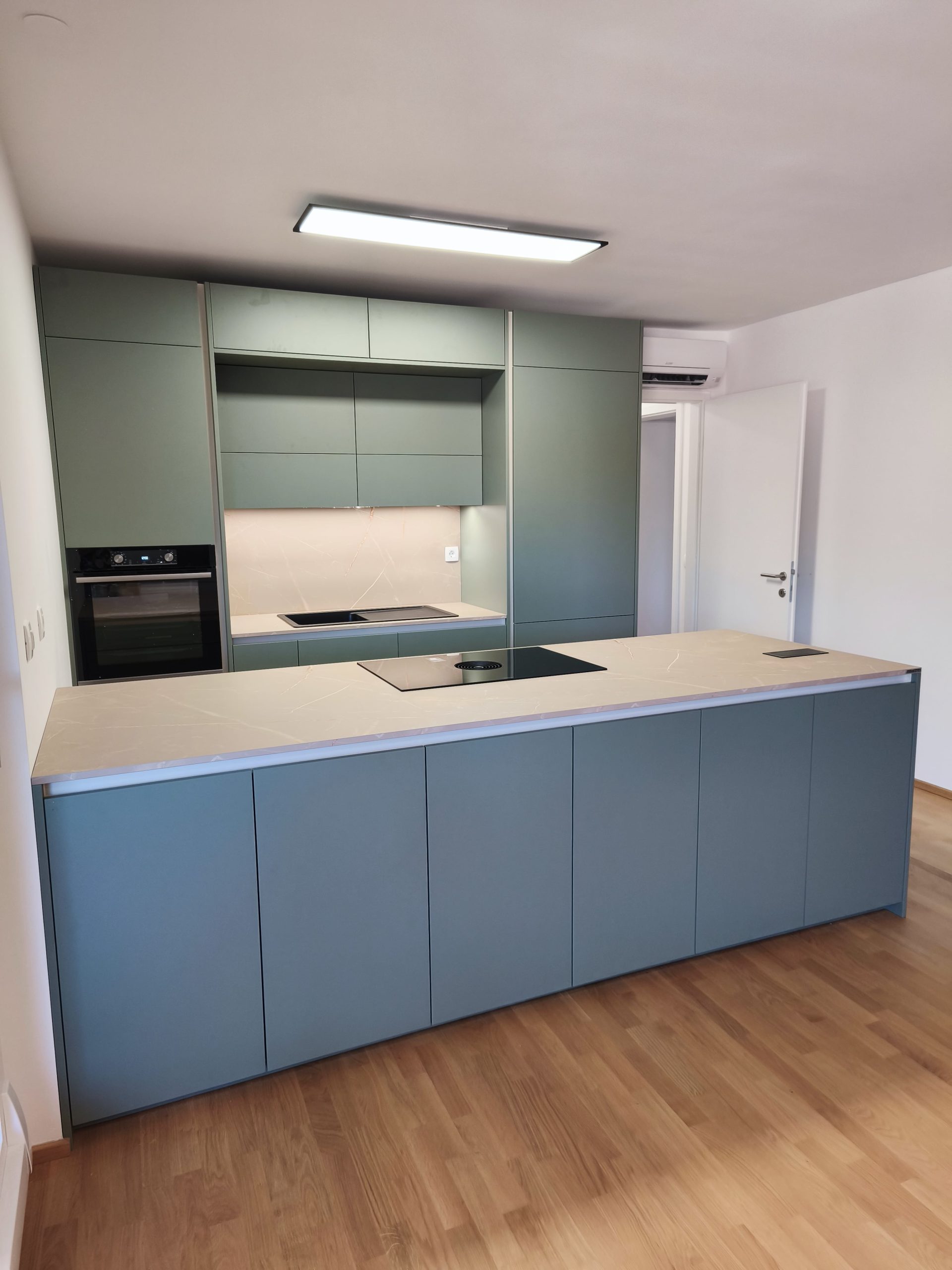 Model Silbermond v umirjenem odtenku Fjord Grün deluje kot svež veter v prostoru – barva, ki prinaša ravnovesje, spokojnost in pridih narave. Zraven smo dodali delovno ploščo v odtenku Lagos, katere nežno strukturirana površina daje prostoru trdnost in eleganco.