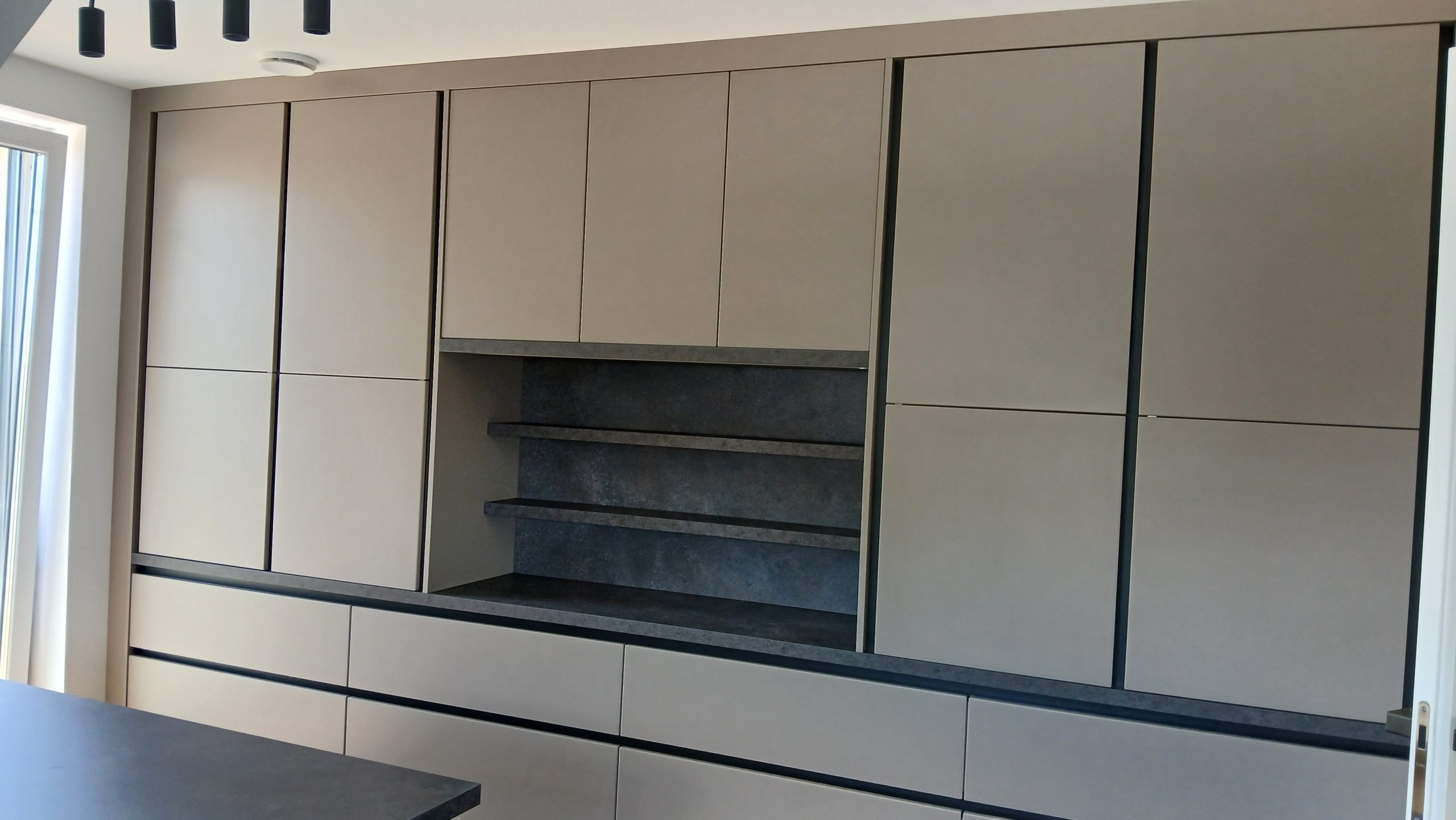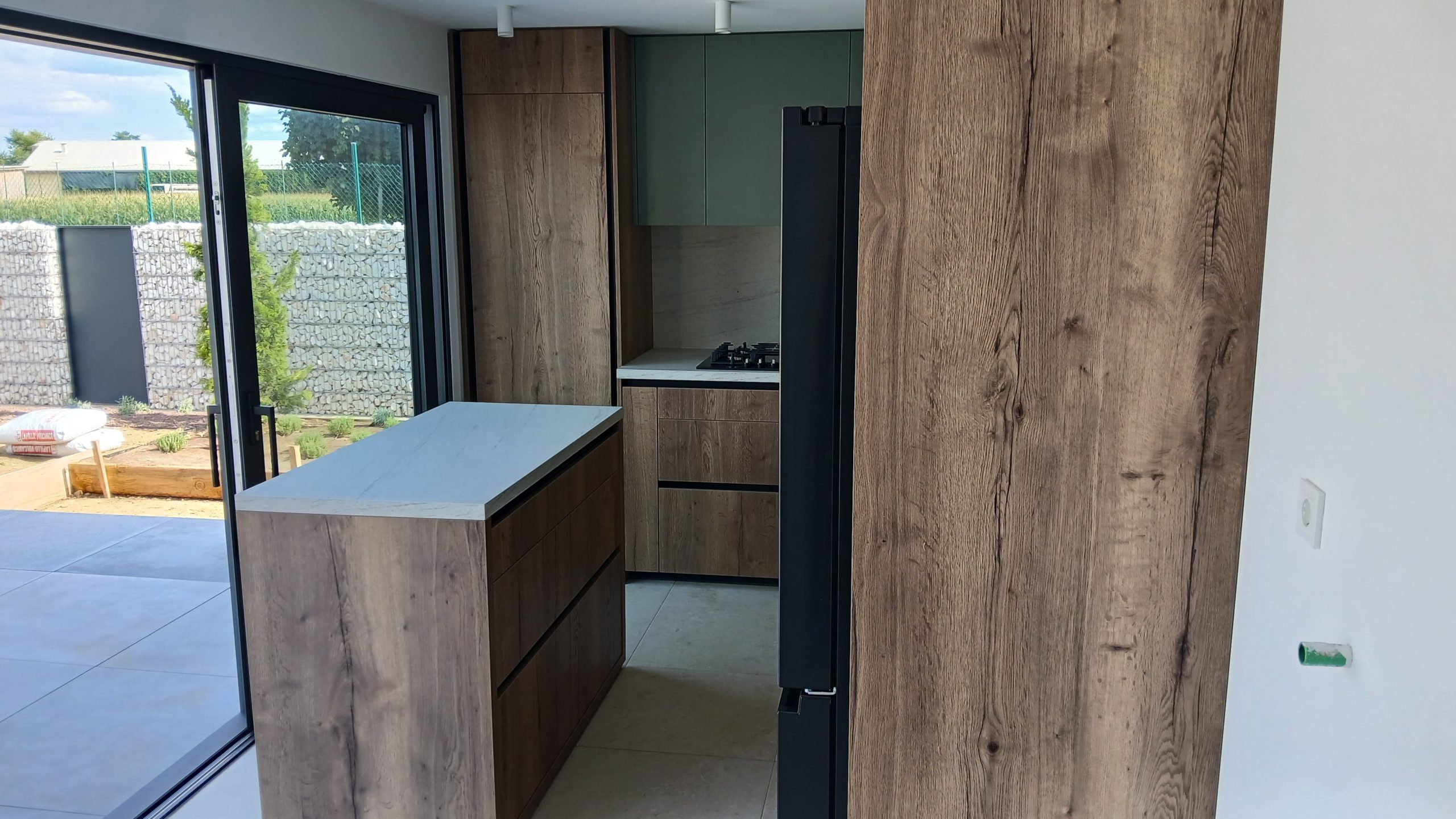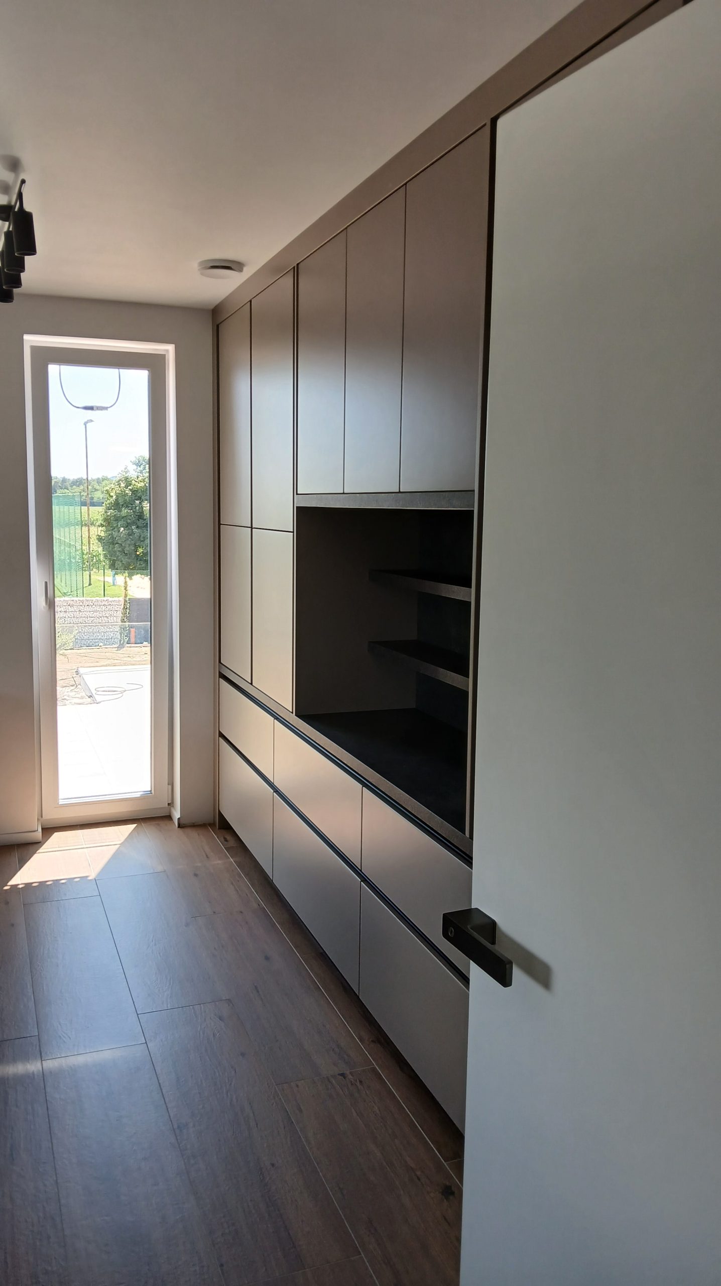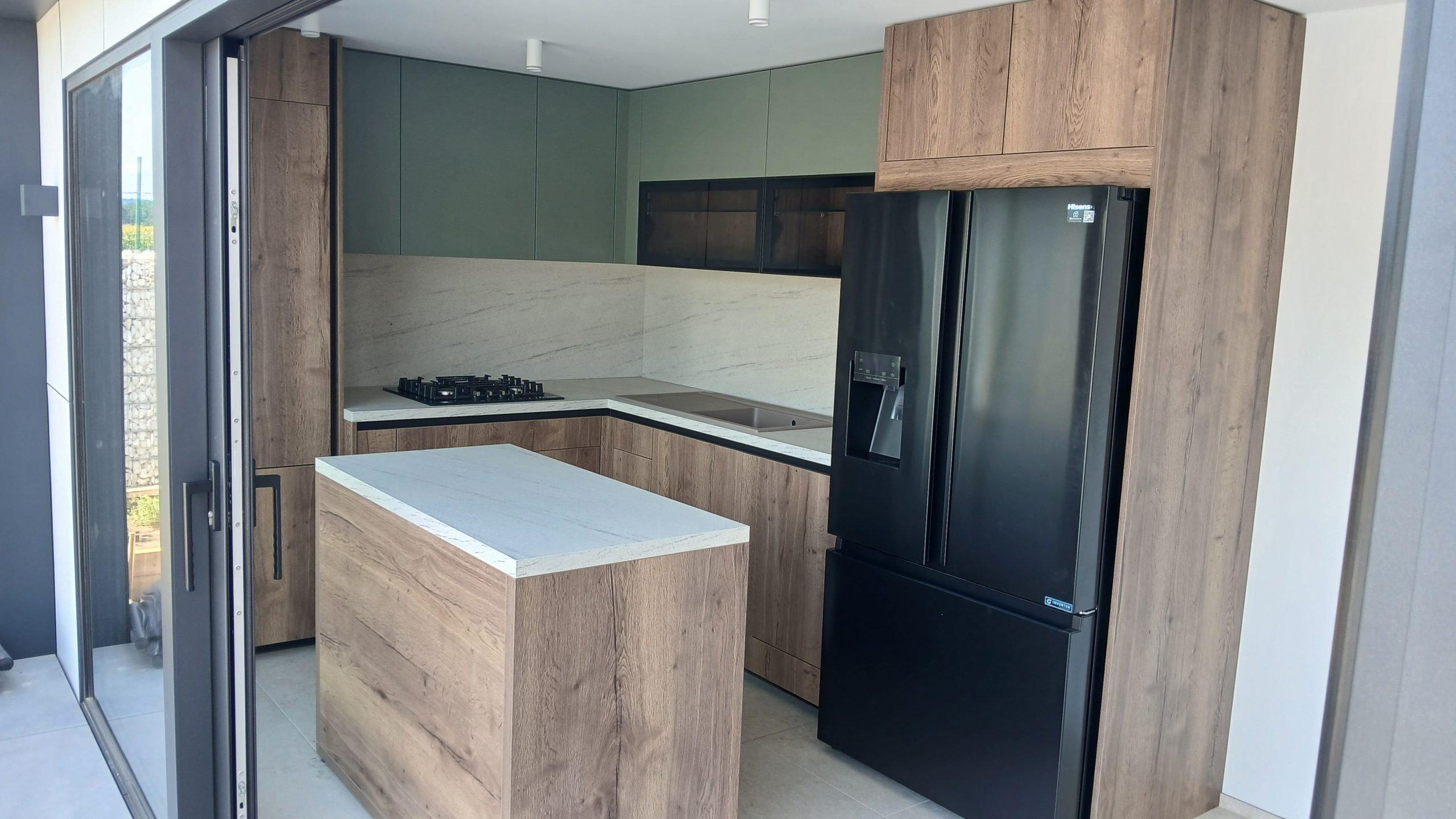 Ker si je stranka želela usklajen videz celotnega doma, smo poleg kuhinje uredili še predsobo, dnevno soboto, mizo ter pisarno v odtenku Savona. Tako smo ustvarili harmonično in estetsko celoto.