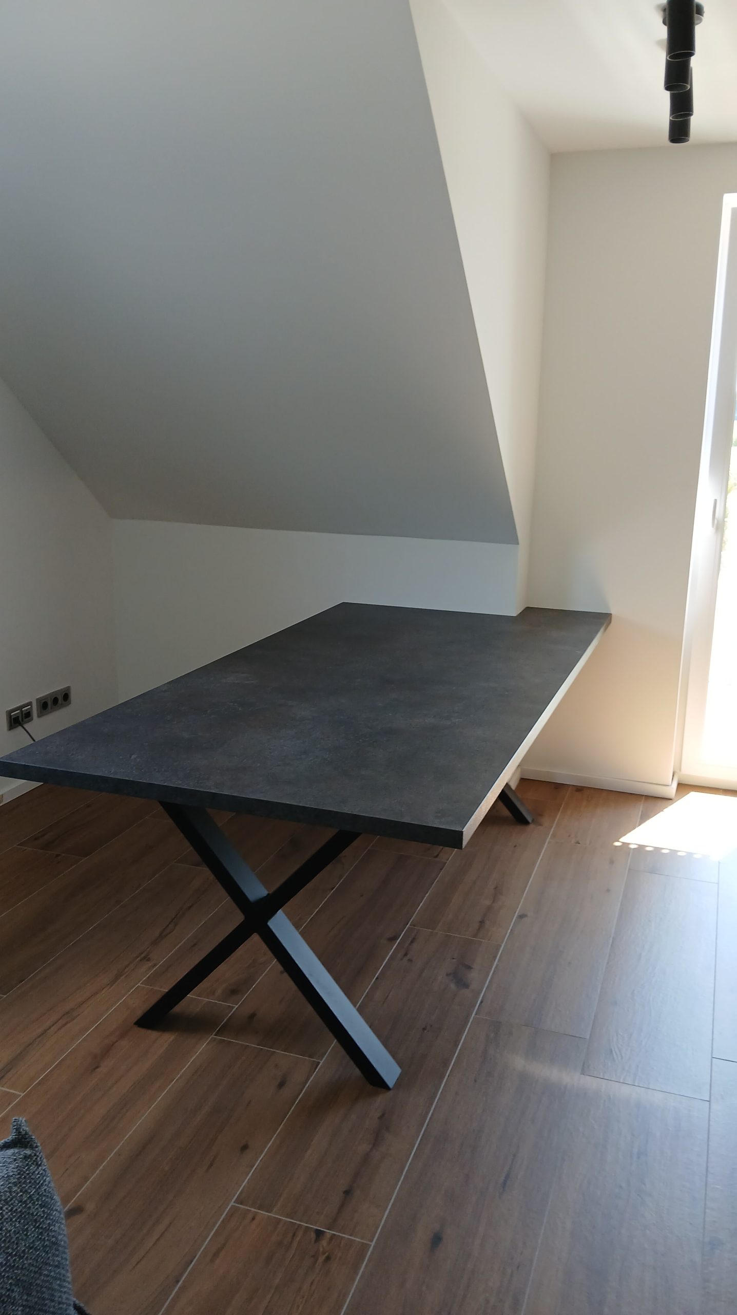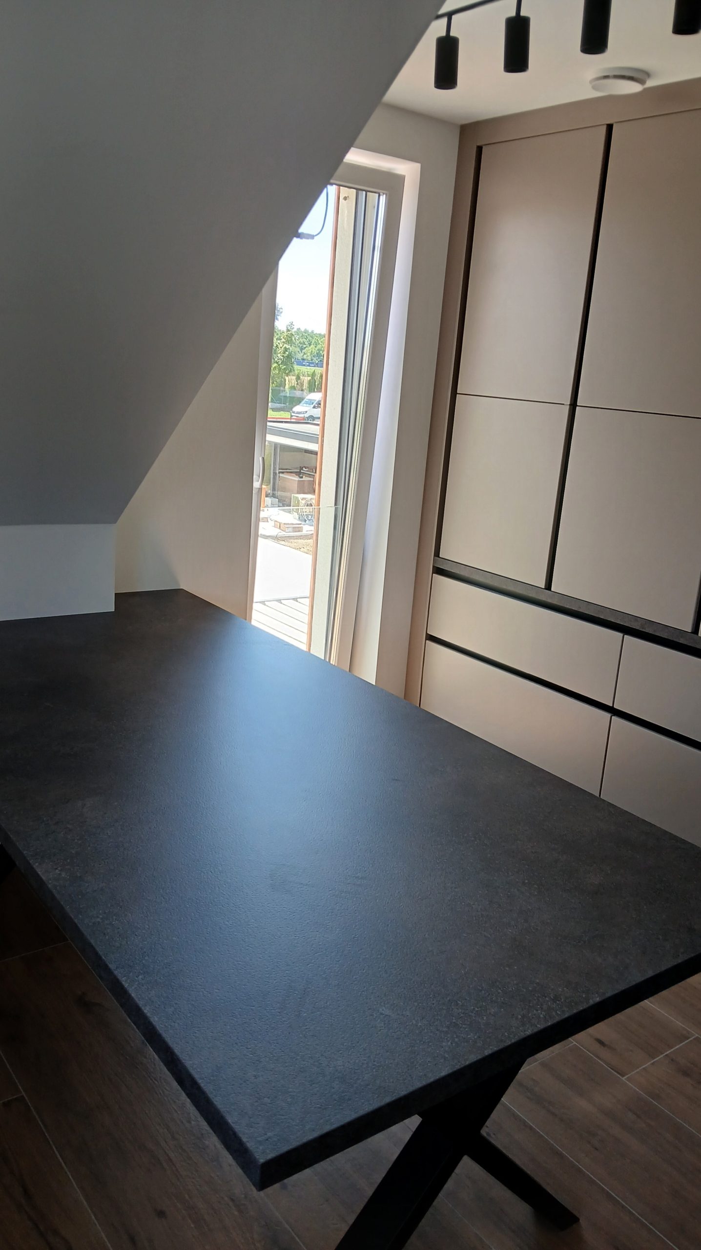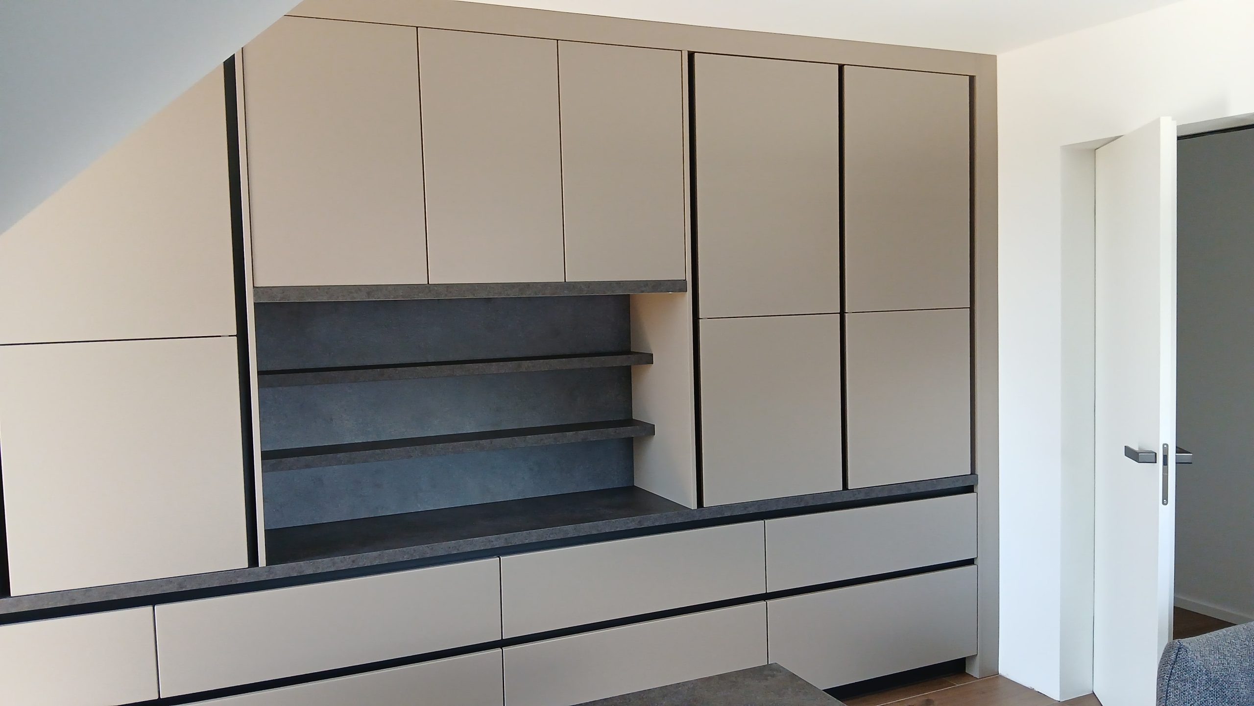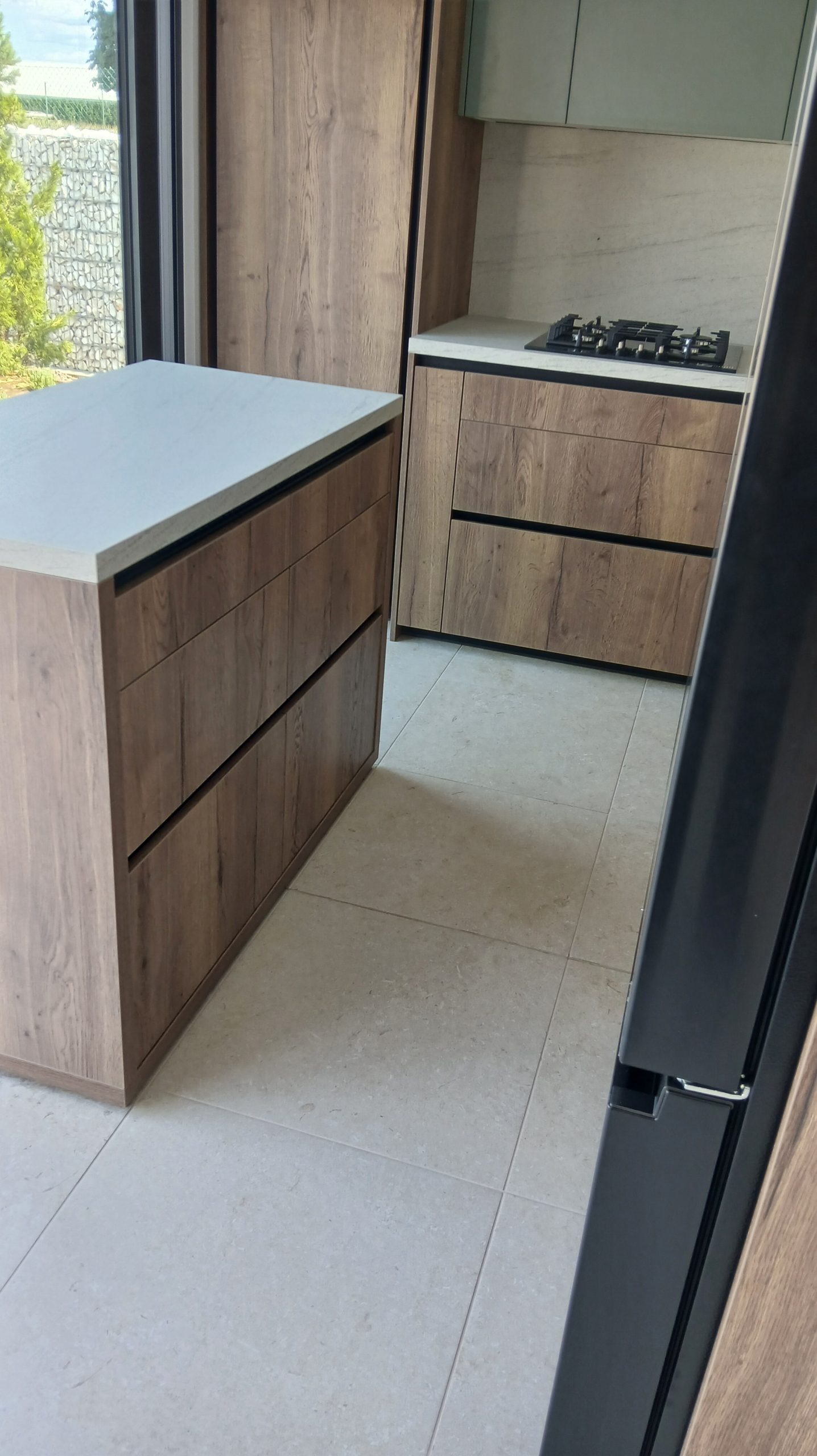 Ker si je stranka želela usklajen videz celotnega doma, smo poleg kuhinje uredili še predsobo, dnevno soboto, mizo ter pisarno v odtenku Savona. Tako smo ustvarili harmonično in estetsko celoto.
