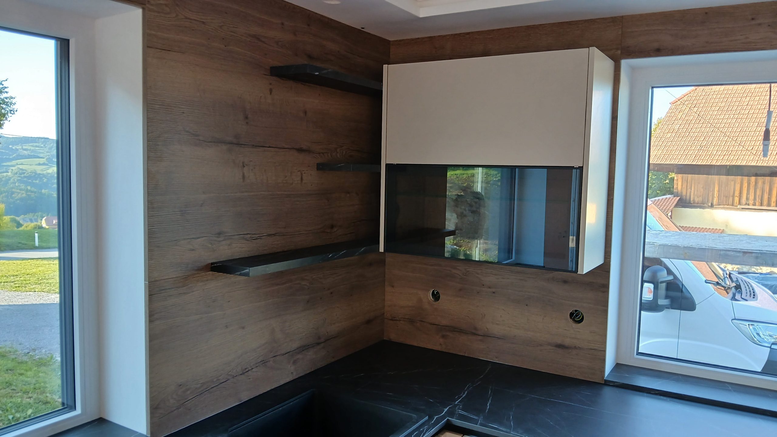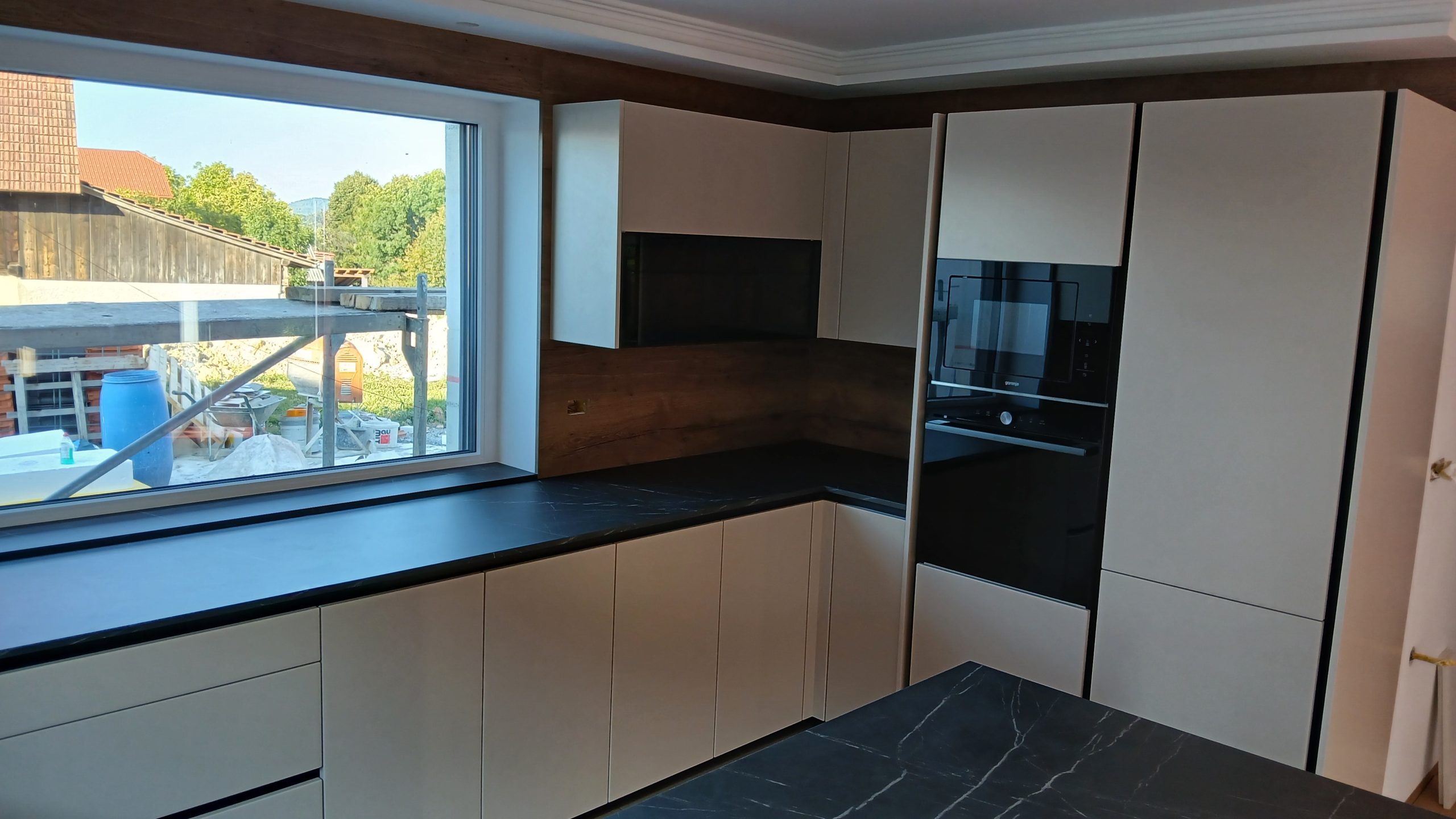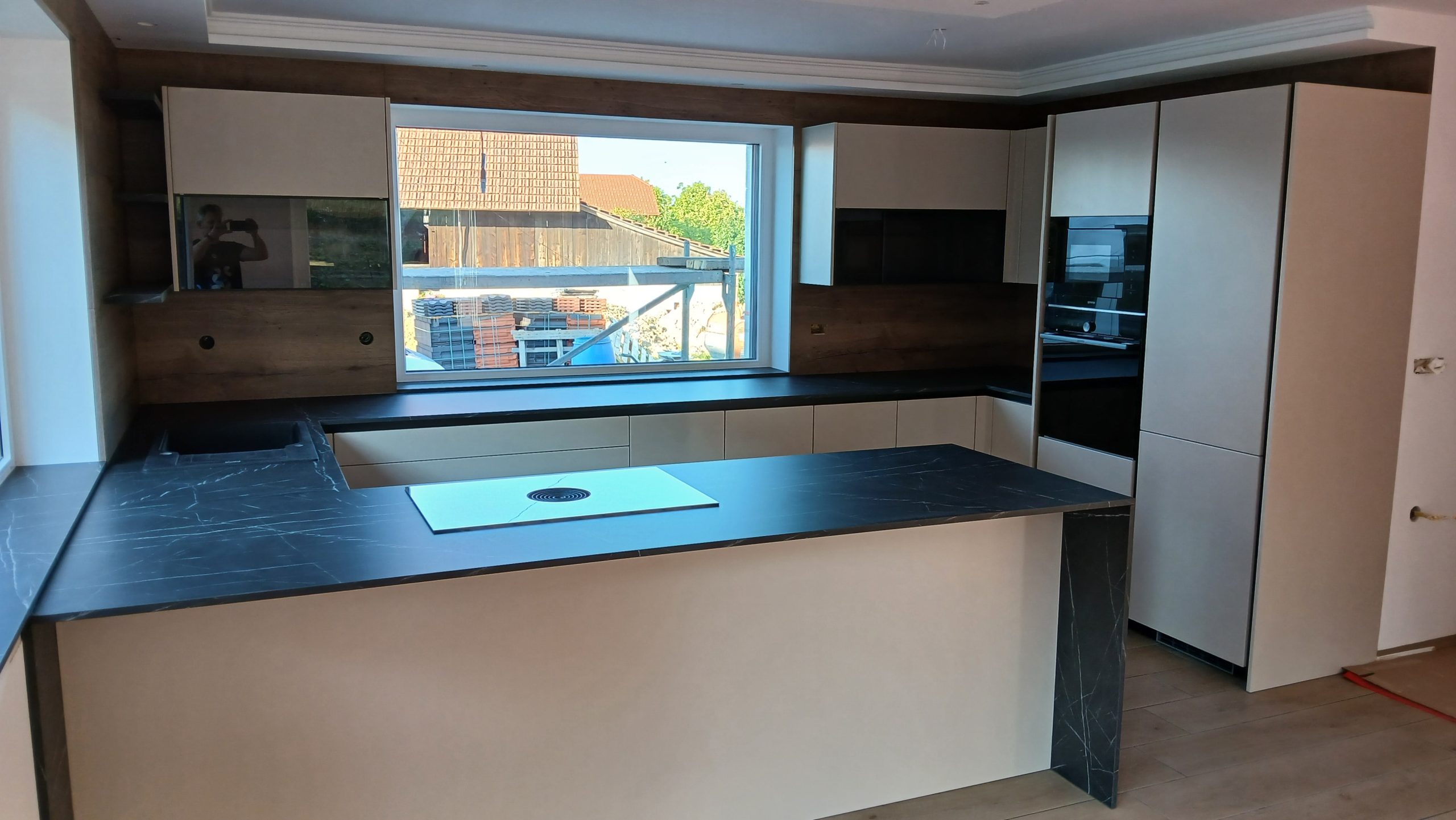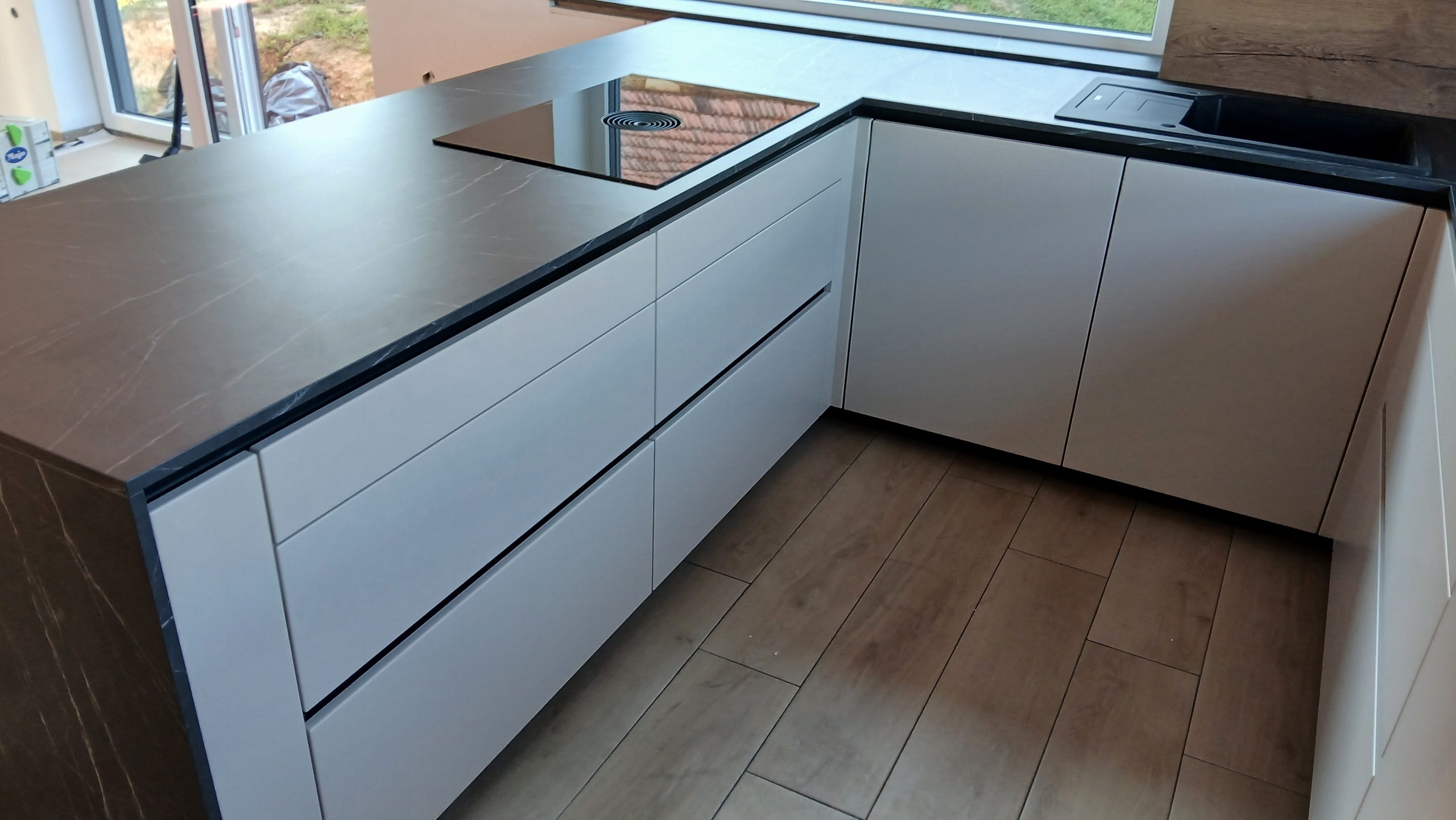 Naraven kontrast smo ustvarili z lesnim odtenkom Tobaco. Ta v kombinaciji z delovno ploščo v odtenku Quarz poudarja prefinjenost in trpežnost.